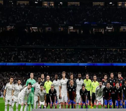 在伯纳乌球场的马德里德比开始前,皇家马德里和马德里竞技的球员以及裁判团队与一幅标语牌合影,以支持当天开展...
