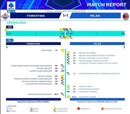 裁判报告底部显示,佛罗伦萨主帅瓦诺利和米兰主帅阿莱格里都吃到了红牌。直播镜头并未显示阿莱格里拿到红牌的画面,不过阿莱格里在比赛结束前就离开了教练席。