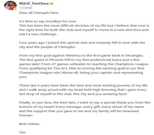 北京时间1月12日,中超联赛最新转会动态,成都蓉城功勋队长周定洋发文告别球队,并被曝已与保级球队完成签约。