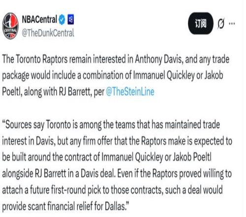 北京时间1月15日,据名记Stein报道,多伦多猛龙队是有意从独行侠队得到安东尼-戴维斯的球队之一,消息人士称,猛龙正在评估完成这笔交易所需的筹码。猛龙的报价将以RJ-巴雷特为核心,另外奎克利和珀尔特尔两人中,将选择一位打包交易。