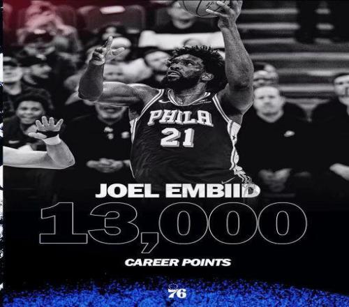 恩比德达成生涯常规赛13000分里程碑,他成为76人队史以76人球员身份第7位达成该成就的球员。